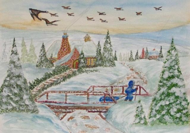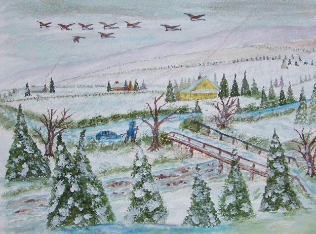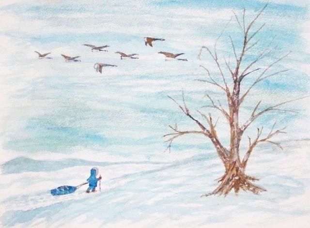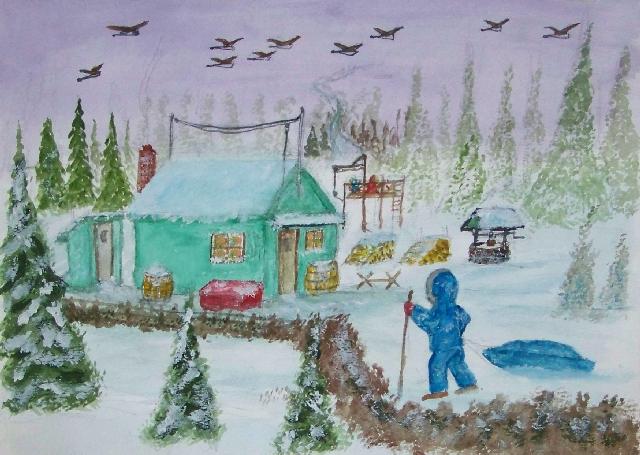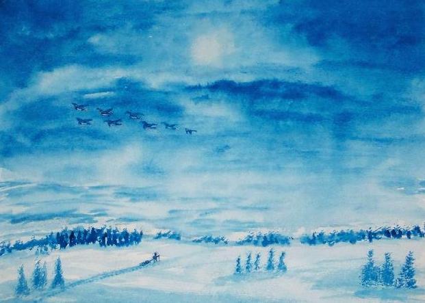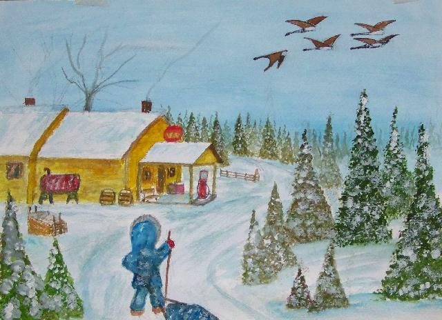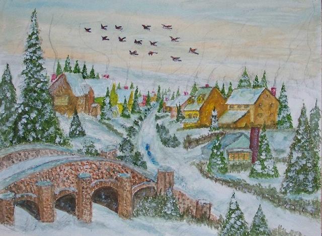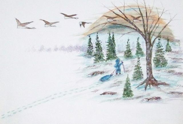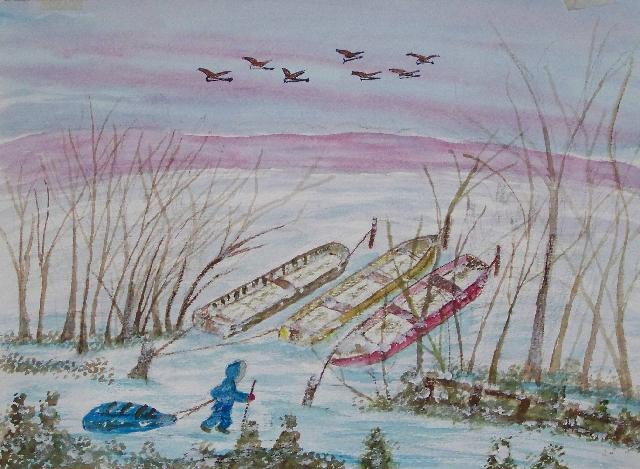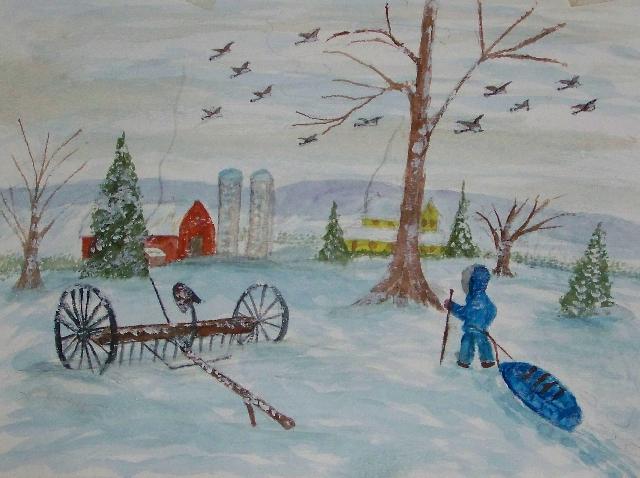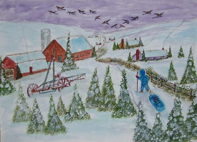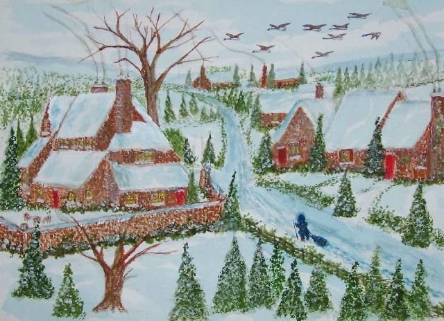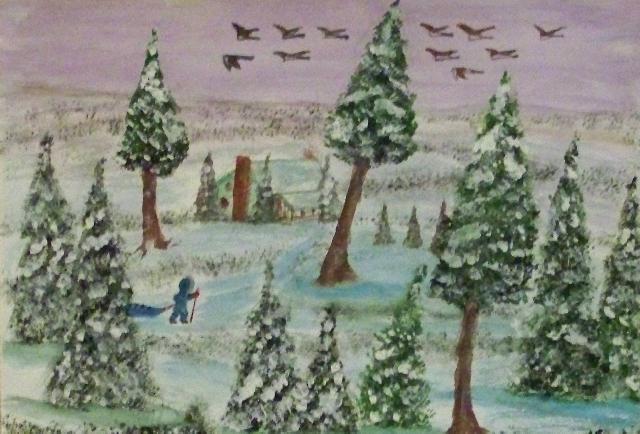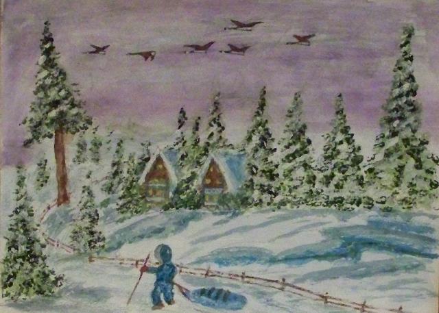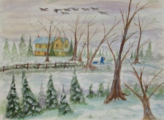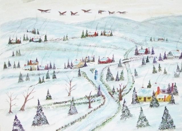 of 530 paintings by our Works-Master, done in Wash and Dry-brush, the primitive style of the winter series shows a lone traveller heading home