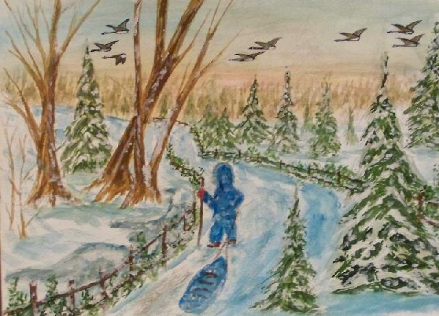 We are pleased to present the Coming Home Watercolour Series of 530 paintings by our Works-Master, done in Wash and Dry-brush, the primitive style of the winter series shows a lone traveller heading home
